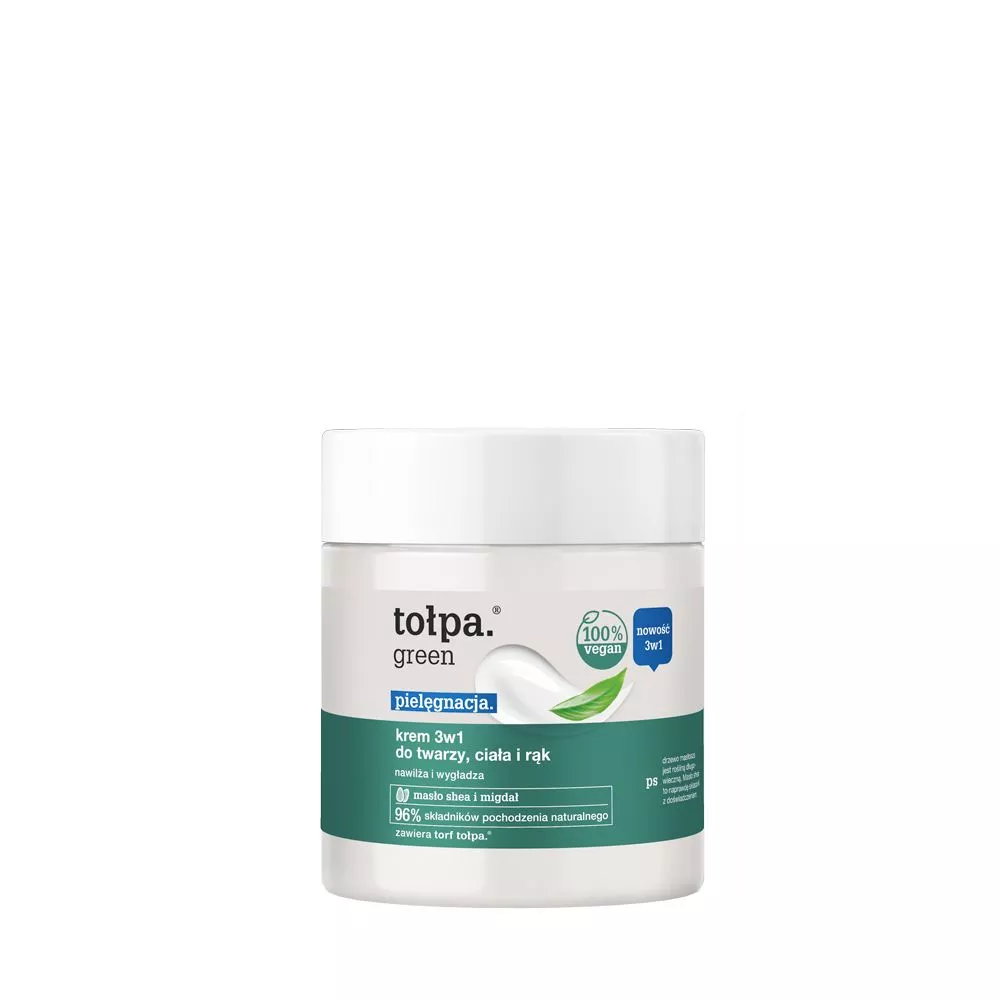 Tołpa Green nawilżający krem 3w1 do twarzy, ciała i rąk to multifunkcyjny kosmetyk o pojemności 250 ml, który zastępuje kilka produktów w codziennej pielęgnacji. Zapewnia długotrwałe nawilżenie, wygładzenie oraz uelastycznienie skóry. Regularne stosowanie sprawia, że skóra staje się gładka, miękka w dotyku i odporna na negatywny wpływ czynników zewnętrznych. Krem eliminuje uczucie ściągnięcia i suchości, szybko się wchłania i nie pozostawia tłustej warstwy, dzięki czemu jest idealny zarówno do twarzy, jak i ciała oraz dłoni.