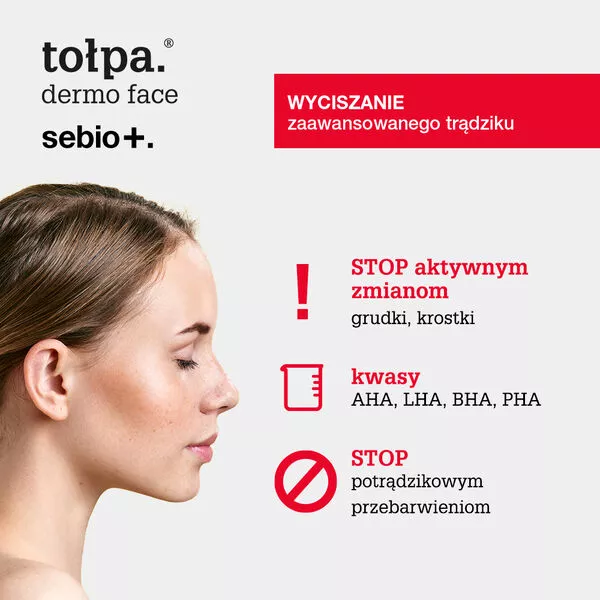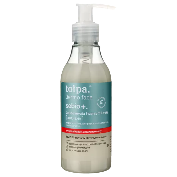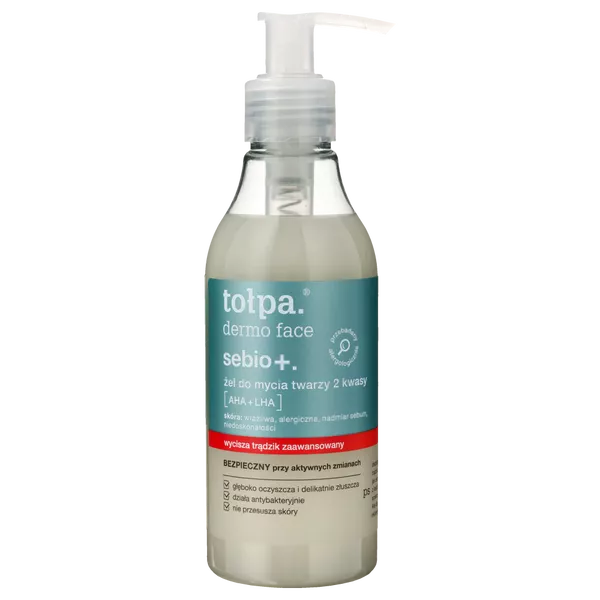 Tołpa Dermo Face Sebio+ Power to innowacyjny żel-pasta do mycia twarzy o unikalnej formule 3 kolorów, stworzony specjalnie dla skóry z aktywnym trądzikiem. Produkt głęboko oczyszcza, delikatnie złuszcza i wycisza aktywne zmiany trądzikowe bez podrażnień. Dzięki połączeniu kwasów AHA (kwas mlekowy) oraz LHA (kwas kapriolowo-salicylowy) skutecznie usuwa zrogowaciały naskórek bez potrzeby pocierania. Żel-pasta odblokowuje pory, niweluje zanieczyszczenia i nadmiar sebum, a także ogranicza powstawanie przebarwień potrądzikowych oraz redukuje widoczność krostek, grudek i zaskórników. Skóra pozostaje oczyszczona, matowa i wolna od uczucia ściągnięcia.