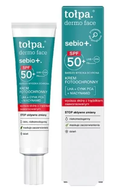 Tołpa Dermo Face Sebio+ SPF 50+ krem fotoochronny do twarzy to zaawansowany dermokosmetyk, stworzony specjalnie dla osób ze skórą trądzikową i problematyczną. Dzięki połączeniu bardzo wysokiej ochrony przeciwsłonecznej (SPF 50+) oraz składników aktywnych, krem skutecznie chroni przed szkodliwym promieniowaniem UVA i UVB, jednocześnie redukując niedoskonałości, łagodząc podrażnienia i zapobiegając powstawaniu przebarwień potrądzikowych. Produkt zapewnia matowe wykończenie, reguluje wydzielanie sebum i przyspiesza regenerację skóry.