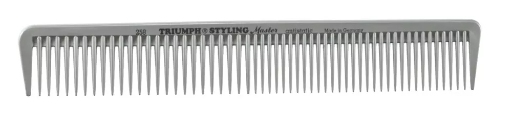 Najwyższej jakości grzebień do włosów z serii Triumph Master firmy Hercules Sagemann. Grzebień prosty przeznaczony do strzyżenia i czesania. Wykonany jest techniką bezzgrzewową, powierzchnia pozbawiona jest jakichkolwiek porów dzięki czemu jest bardzo higieniczny, antybakteryjny i odporny na działanie wszelkich chemikaliów. Ząbki grzebienia dodatkowo są polerowane aby nie szarpały i nie naruszały struktury włosa. Wykonany z materiału termicznego odpornego na działanie wysokich temperatur.
