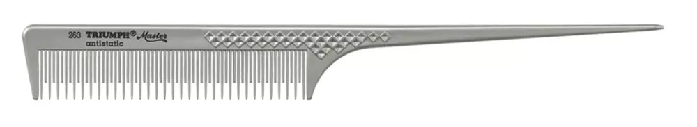By ułatwić sobie pracę w salonie korzystaj tylko z najlepszych marek. Taką jest właśnie Hercules Sagemann, która specjalnie dla Ciebie przygotowała rewelacyjny grzebień Triumph Master. Wyposażony został w szpikulec, by ułatwić chociażby dzielenie włosów na partie. Przyrząd wykonany jest techniką bezzgrzewową, co oznacza, że powierzchnia pozbawiona jest jakichkolwiek porów. W efekcie czego jest bardzo higieniczny, antybakteryjny oraz odporny na działanie chemikaliów fryzjerskich, np. farb. Ząbki grzebienia wypolerowano tak, aby nie szarpały i nie naruszały struktury włosa. Ponadto grzebień wykonany jest z materiału termicznego, który chroni go przed działaniem wysokich temperatur.