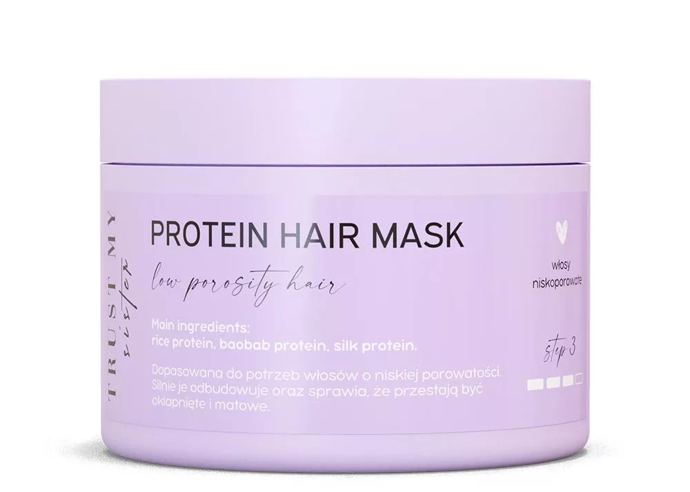 Oznakami niskiej porowatości jest delikatność włosów, brak objętości, oklapnięcie, skłonność do puszenia. Wszystkie te problemy rozwiązuje maska proteinowa do włosów niskoporowatych Trust My Sister. Kosmetyk skutecznie regeneruje włosy bez ich obciążania, nawilża, dodaje blasku i sprężystości. Maska zawiera olej z nasion baobabu, białko ryżu, keratynę i płynny jedwab.