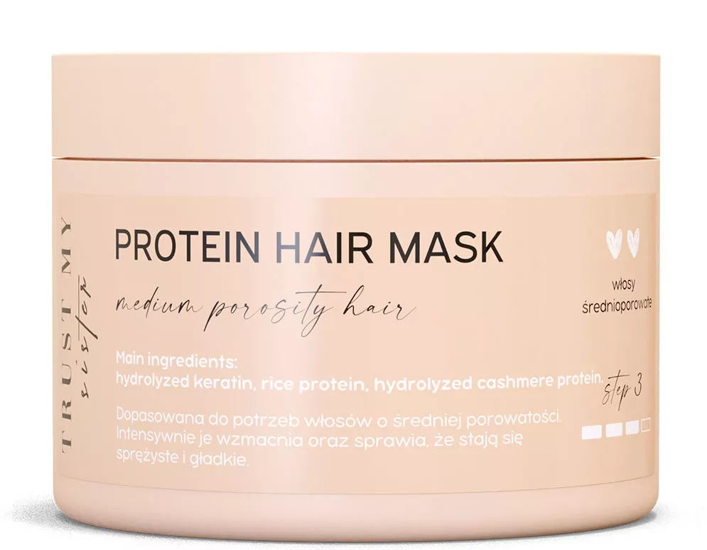 Twoje włosy są w całkiem dobrej kondycji, ale mają tendencję do puszenia i wydają się być bez życia? Przywróć im witalność i piękny wygląd stosując maskę proteinową. Dzięki zawartości protein małocząsteczkowych idealnie sprawdza się w pielęgnacji włosów o średniej porowatości. Maska do włosów średnioporowatych Trust My Sister zapewnia kosmykom optymalne nawilżenie, zapobiega elektryzowaniu, odbudowuje włosy i wzmacnia je. Włosy przestają się puszyć, są zdyscyplinowane, mniej wypadają i szybciej rosną. A do tego są miękkie i gładkie. Maska rozwiązuje też problem rozdwojonych końcówek.