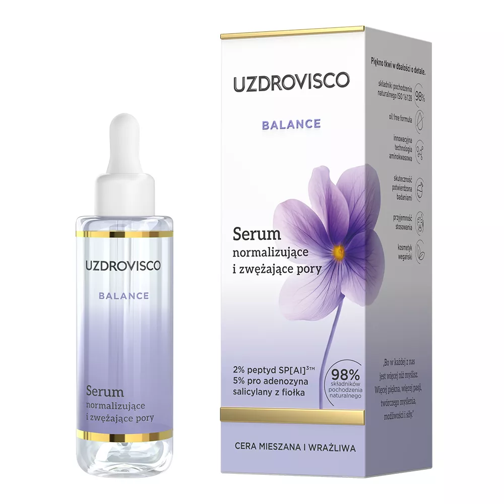 Uzdrovisco Balance serum normalizujące i zwężające pory 30ml to zaawansowana pielęgnacja dedykowana cerze mieszanej i wrażliwej. Dzięki wysokim stężeniom składników aktywnych, efekty są widoczne już od pierwszego użycia. Kosmetyk zachwyca przyjemnością stosowania i pięknym zapachem.