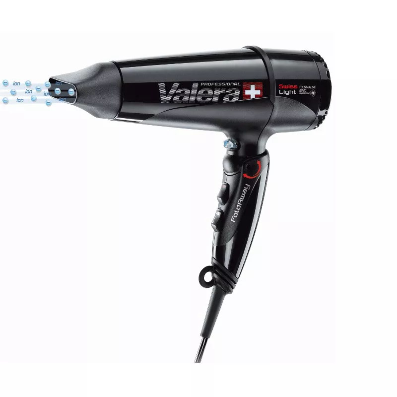 Suszarka do włosów Valera Swiss Light 5400 Fold-Away Ionic posiada składany uchwyt, dzięki temu doskonale sprawdzi się w podróży lub w mniejszej łazience. Została wyposażona w generator jonów ujemnych, dzięki temu ma działanie antystatyczne i ochronne. Urządzenie posiada silnik o długiej żywotności oraz 6 ustawień przepływu powietrza. Dla wygody użytkowania suszarka wyposażona jest w trzymetrowy, obrotowy kabel. Posiada również przycisk chłodnego powietrza.