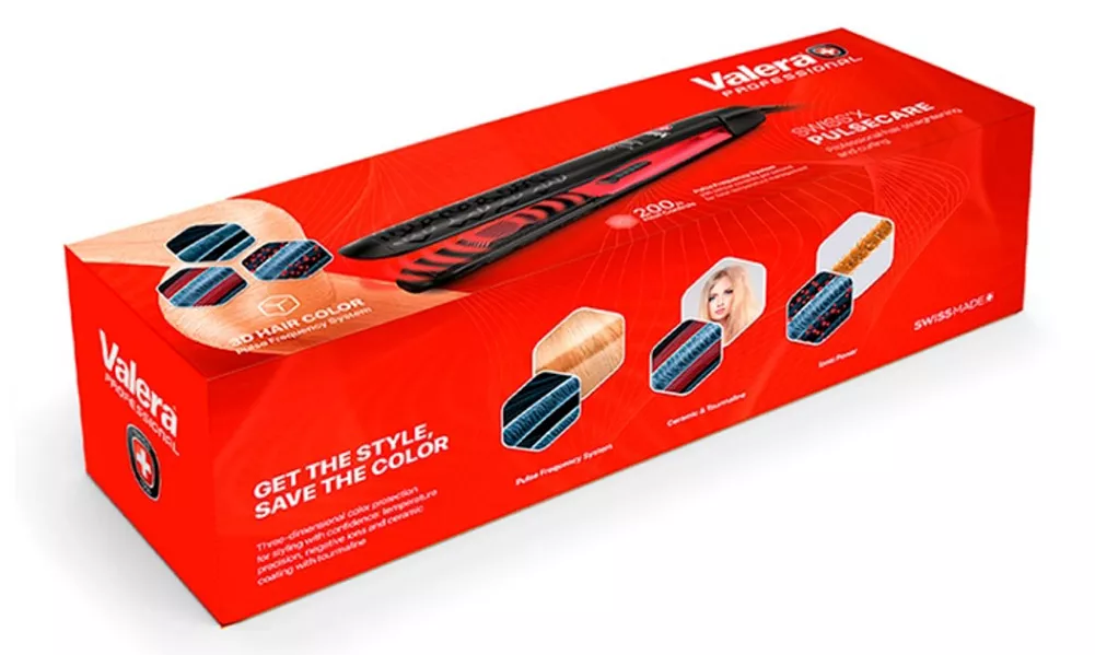 Ta prostownica do włosów spełnia oczekiwania każdego profesjonalisty. Zaprojektowano z nią z myślą o każdym szczególe. Prostownica do włosów Valera Swiss'X Pulse Care posiada pływające płytki pokryte aż 5 warstwami ceramiki. Dzięki temu włosy są idealnie gładkie, lśniące, miękkie i optymalnie nawilżone. Prostownica posiada wbudowany generator jonów, który niweluje puszenie włosów i zapewnia pasmom ochronę przed zniszczeniami. O doskonałe efekty stylizacji zadba również technologia Pulse Care. Specjalne czujniki w płytkach prostownicy Valera 200 razy na sekundę sprawdzają temperaturę i utrzymują ją na odpowiednim poziomie. Dła łatwości stylizacji urządzenie Valera wyposażono w nienagrzewające się końcówki od długi, obrotowy przewód zasilający. Urządzenie wyłącza się automatycznie po 60 minutach pracy. Ale to nie wszystko! Zaokrąglony kształt obudowy pozwala kręcić piękne loki.