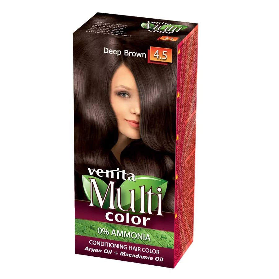 Venita MultiColor to pielęgnacyjna farba do włosów w odcieniu 4.5 Ciemny Brąz, która łączy w sobie właściwości koloryzujące i pielęgnacyjne. Wzbogacona o naturalne olejki arganowy i macadamia, zapewnia włosom odżywienie, nawilżenie i regenerację. Dzięki tej farbie, Twoje włosy będą miękkie, nawilżone i pełne blasku. Regularne stosowanie farby MultiColor zapewnia głębszy kolor oraz poprawia jego trwałość.