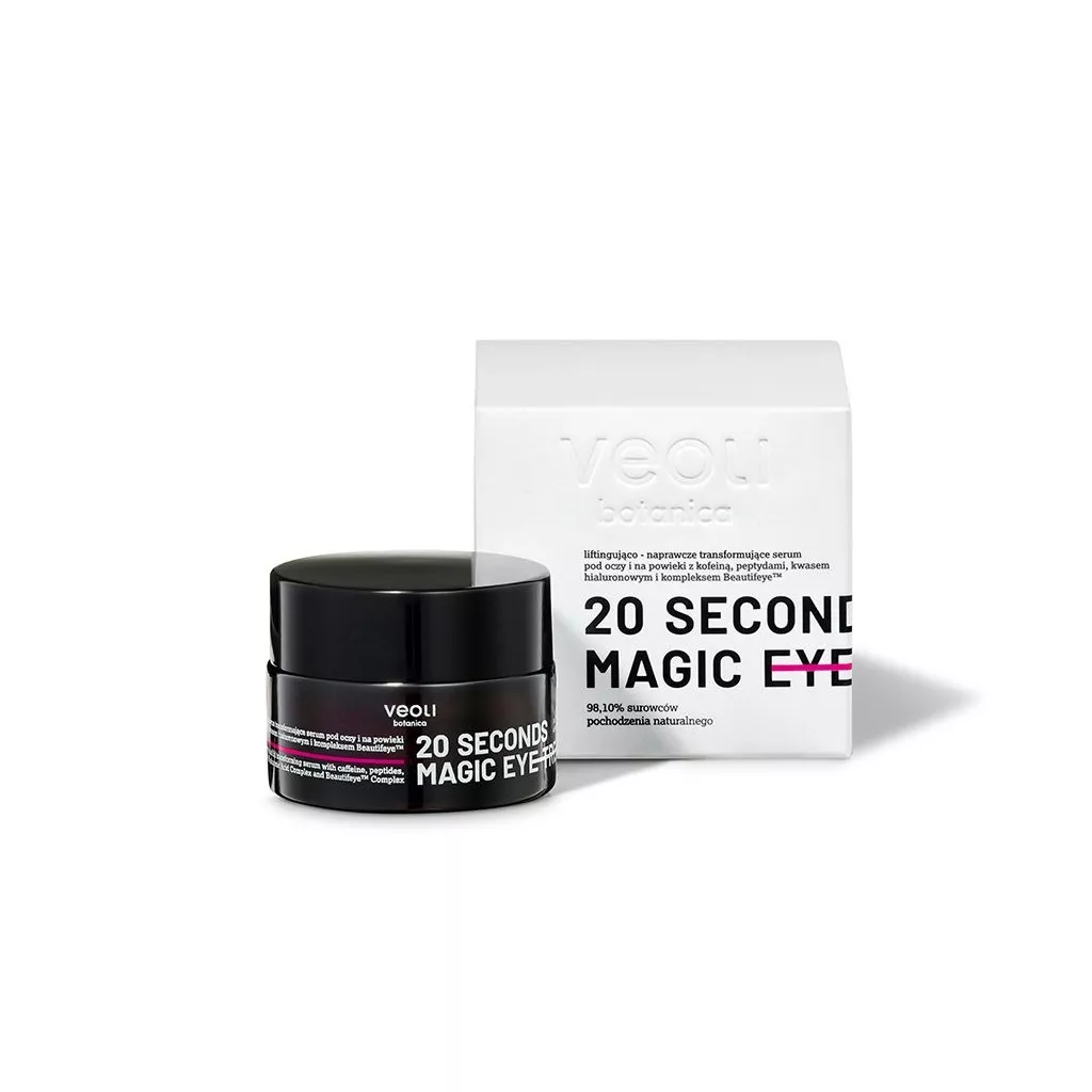 Veoli Botanica 20 Seconds Magic Eye Treatment to liftingująco-naprawcze serum pod oczy i na powieki, które zawiera kofeinę, peptydy, kwas hialuronowy i kompleks Beautifeye™. Zawiera 98,10% surowców pochodzenia naturalnego, co sprawia, że jest idealnym wyborem dla osób poszukujących naturalnej pielęgnacji skóry wokół oczu.