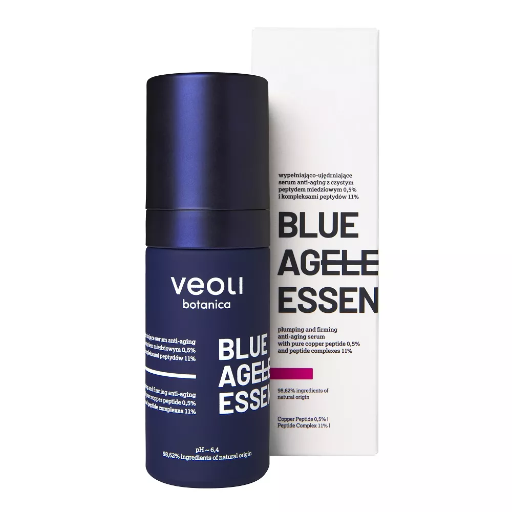 Veoli Botanica Blue Ageless Essence to wypełniająco-ujędrniające serum anti-aging, które zawiera czysty peptyd miedziowy 0,5% i kompleksy peptydów w stężeniu 11%. Produkt składa się w 98,62% ze składników pochodzenia naturalnego, co czyni go idealnym wyborem dla osób poszukujących naturalnych rozwiązań w pielęgnacji skóry.