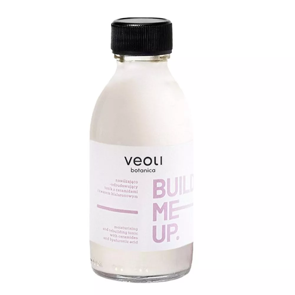 Veoli Botanica Build Me Up to nawilżająco-odbudowujący tonik z ceramidami i kwasem hialuronowym, idealny do codziennej, holistycznej pielęgnacji skóry. Dzięki 99% składników naturalnego pochodzenia, produkt wspiera odbudowę i wzmocnienie bariery lipidowej naskórka, a także intensywnie nawilża, przywracając skórze komfort i fizjologiczne pH.