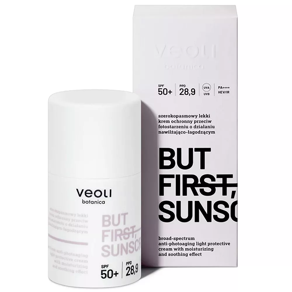 Veoli Botanica But First Sunscreen to lekki krem ochronny przeciw fotostarzeniu, który zapewnia kompleksową ochronę skóry przed szkodliwym promieniowaniem słonecznym. Dzięki innowacyjnym filtrom przeciwsłonecznym, krem chroni skórę przed promieniowaniem UVA, UVB oraz szkodliwym światłem niebieskim (HEV) i światłem podczerwonym (IR), które mogą przyspieszyć starzenie się skóry.