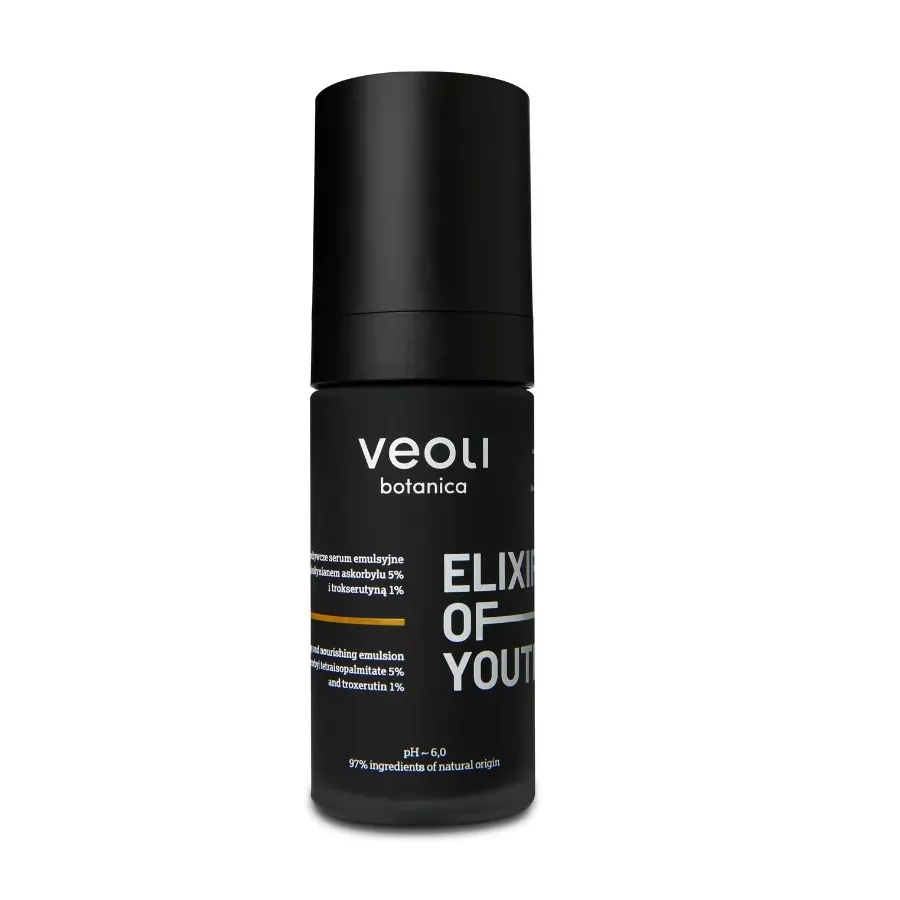 Odkryj moc Veoli Botanica Elixir Of Youth – rozjaśniająco-odżywcze serum emulsyjne wzbogacone o 5% tetraizopalmitynianu askorbylu i 1% trokserutyny, które dostarcza skórze niesamowitych korzyści. Dzięki 97% składników pochodzenia naturalnego i pH w przedziale 5,8-6,8, serum wykazuje wysokie powinowactwo do warstwy lipidowej skóry, zapewniając doskonałą przyswajalność.