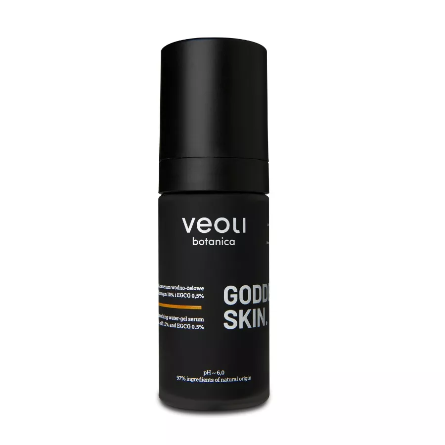 Veoli Botanica Goddess Skin to rozjaśniająco-kojące serum wodno-żelowe z etylowanym kwasem askorbinowym 10% i EGCG 0,5%. Zawiera 97% składników pochodzenia naturalnego, a jego pH mieści się w przedziale 5,0-6,0. Serum zostało zaprojektowane, aby rozjaśniać nawet utrwalone przebarwienia, poprawiać koloryt skóry oraz chronić przed wolnymi rodnikami i przedwczesnym starzeniem się skóry. Produkt jest idealny dla skóry wrażliwej i skłonnej do zapychania.