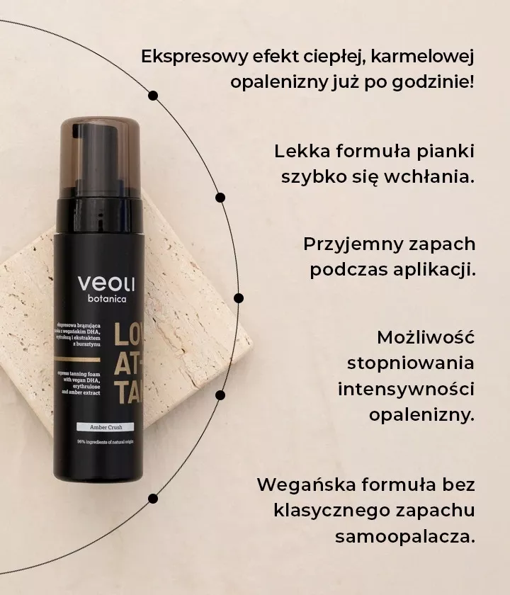 Veoli Botanica Love at First Tan Amber Crush to ekspresowa brązująca pianka, która w ciągu godziny nada Twojej skórze naturalny, ciepły karmelowy odcień. Dzięki lekkiej formule, produkt zapewnia równomierną aplikację, nie pozostawiając plam i smug. Wegańska formuła intensywnie nawilża i wygładza skórę, a ekstrakt z bursztynu wspomaga jej regenerację, wzmacniając efekt brązujący.