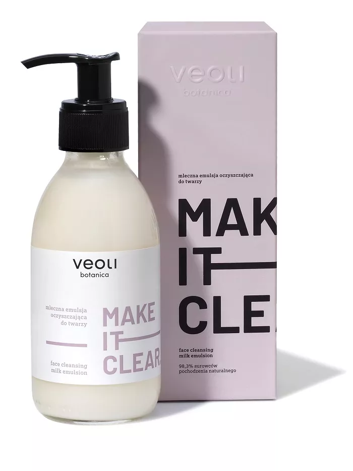 Veoli Botanica Make It Clear to mleczna emulsja oczyszczająca do twarzy, składająca się w 98,3% z surowców pochodzenia naturalnego. Jej wyjątkowo skuteczna i delikatna formuła bazuje wyłącznie na naturalnych składnikach myjących, takich jak oleje słonecznikowy i winogronowy, które dokładnie usuwają zanieczyszczenia i zabezpieczają naturalną warstwę hydrolipidową skóry. Receptura została wzbogacona olejem z pestek moreli, będącym źródłem witaminy A i E, który działa łagodząco, nawilża i zmiękcza skórę. Emulsja nie wywołuje uczucia ściągania i pomaga zachować prawidłową kondycję skóry. Jest polecana do wszystkich typów skóry, w tym wrażliwej i skłonnej do podrażnień.