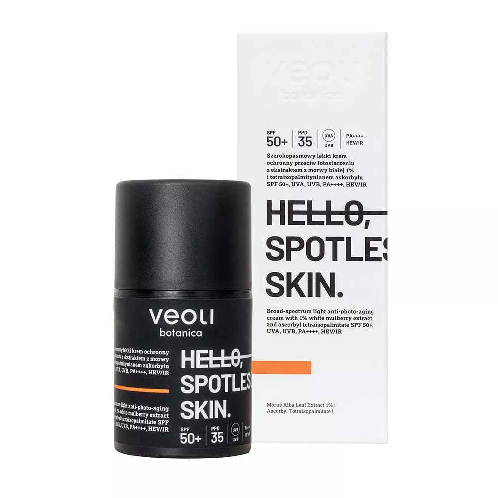 Szukasz skutecznej, całorocznej ochrony przeciwsłonecznej, która jednocześnie pomoże Ci zredukować przebarwienia i rozjaśnić cerę? Poznaj Hello, Spotless Skin — lekki, komfortowy krem z szerokopasmową ochroną UVB, UVA, HEV i IR, stworzony z myślą o skórze wymagającej skutecznej ochrony przed fotostarzeniem oraz wsparcia w walce z nierównym kolorytem.