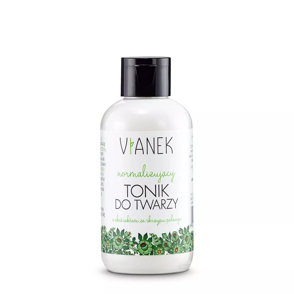 Vianek, Normalizujący tonik do twarzy, to delikatny kosmetyk o niskim pH (3.0), stworzony z myślą o codziennej pielęgnacji cery przetłuszczającej się i problematycznej. Dzięki starannie dobranym składnikom, takim jak ekstrakt ze skrzypu polnego i aloesu, tonik ten skutecznie normalizuje wydzielanie sebum, nawilża skórę oraz przyspiesza jej regenerację. Kwas jabłkowy redukuje powstawanie zaskórników, subtelnie oczyszcza i rozjaśnia przebarwienia, a dodatek olejku miętowego zapewnia przyjemne odświeżenie i przywraca równowagę skóry.