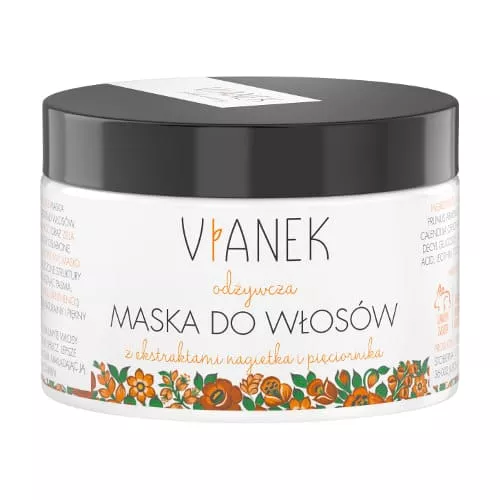 Vianek Odżywcza maska do włosów to produkt bogaty w składniki odżywcze i regenerujące, stworzony z myślą o pielęgnacji każdego rodzaju włosów. Maska zawiera ekstrakt z kwiatów nagietka lekarskiego i ziela pięciornika gęsiego, które wzmacniają włosy osłabione i pozbawione blasku. Dodatkowo, olej z pestek moreli, olej rycynowy, masło avocado i lecytyna sojowa odbudowują zniszczone struktury włosów, zapobiegając ich łamliwości i zapewniając idealną gładkość pasm. Składniki nawilżające, takie jak miód i panthenol, pomagają włosom odzyskać ich naturalny, piękny wygląd.