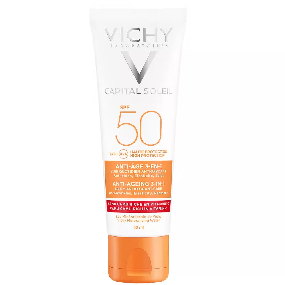 Vichy Capital Soleil krem przeciwstarzeniowy do twarzy 3w1 SPF50 50ml to idealne rozwiązanie, które łączy w sobie właściwości kremu przeciwzmarszczkowego i ochrony przeciwsłonecznej. Działa kompleksowo na oznaki starzenia, jednocześnie zapewniając skórze skuteczną ochronę przed szkodliwym działaniem promieniowania UV.