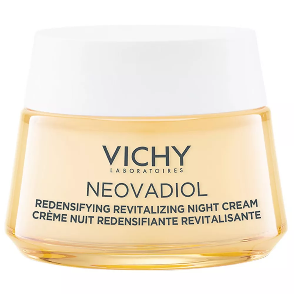 Vichy Neovadiol Peri-Menopause to ujędrniający krem na noc, który przywraca gęstość skóry, pomagając wygładzić jej strukturę, poprawić blask i zapewnić efekt chłodzenia. W okresie menopauzy zmiany hormonalne, takie jak wzrost kortyzolu i spadek estrogenu, mogą przyspieszać proces starzenia, prowadząc do utraty gęstości i elastyczności skóry. Ten krem na noc reaktywuje mechanizmy skóry, poprawiając jej jędrność i gęstość.