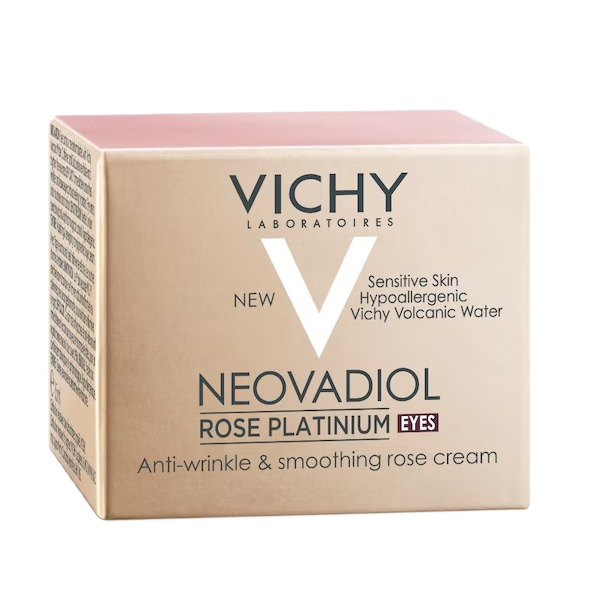 Przywróć blask spojrzeniu z kremem Neovadiol Rose Platinium od Vichy! Ten odżywczy krem pod oczy z różanym pigmentem został opracowany, aby redukować opuchnięcia, cienie i wygładzać zmarszczki. Formuła zawiera zmniejszającą opuchliznę kofeinę, wzmacniający wapń oraz kojącą wodę wulkaniczną Vichy. Efekt? Skóra staje się gładsza, bardziej promienna i wyraźnie rozświetlona.