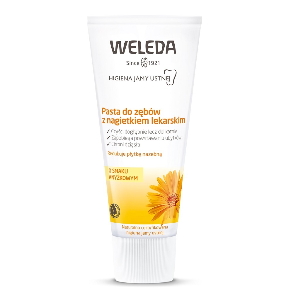 Weleda Pasta do zębów z nagietkiem lekarskim 75ml to naturalna formuła stworzona specjalnie do skutecznej i łagodnej pielęgnacji jamy ustnej. Dzięki zawartości przeciwzapalnego ekstraktu z nagietka lekarskiego pasta idealnie wspiera wrażliwe dziąsła, a drobinki mineralne delikatnie oczyszczają zęby z osadów. Odświeżający olejek eteryczny z kopru włoskiego nadaje paście przyjemny smak, a brak mięty pozwala bezpiecznie stosować produkt podczas terapii homeopatycznej. Pasta pomaga zachować naturalną świeżość oraz czystość jamy ustnej, nie zawiera cukru, syntetycznych substancji słodzących, surfaktantów, sztucznych konserwantów, dodatków smakowych, barwników ani składników pochodzących z olejów mineralnych.