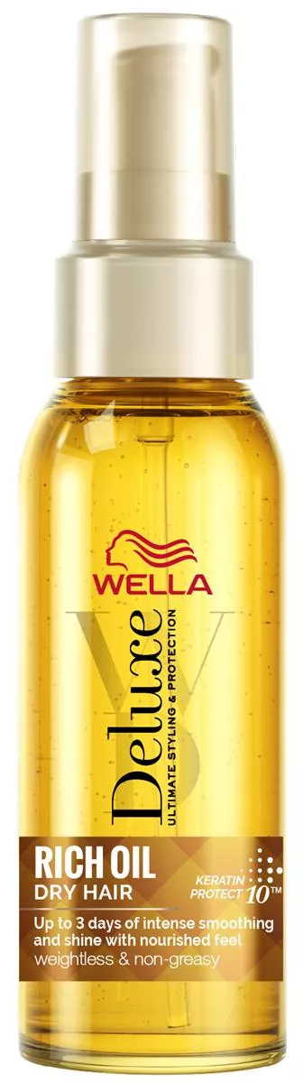 Bogaty olejek do włosów suchych i zniszczonych Wella Deluxe Rich Oil to intensywnie nawilżający kosmetyk do stylizacji, który pielęgnuje i odżywia włosy dzięki wyjątkowej formule z olejkami z awokado, kokosa i drzewa herbacianego. Produkt ten nie tylko pomaga ułożyć i utrwalić fryzurę, ale również posiada właściwości pielęgnacyjne. Nie obciąża włosów, pozwalając cieszyć się ich lekkością i pięknym blaskiem, a także nadaje subtelny zapach. Efekt wygładzenia i blasku utrzymuje się aż do 3 dni. Dzięki formule, która pielęgnuje cienkie i zniszczone włosy, olejek zapewnia jedwabistą gładkość i zdrowy wygląd.