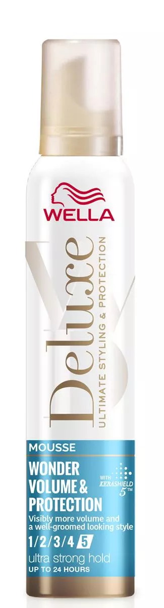Pianka do włosów Wella Deluxe Wonder Volume Protection to idealne rozwiązanie dla osób pragnących nadać swoim włosom zwiększoną objętość i ultra mocne utrwalenie. Formuła zawiera keratynowy kompleks ochronny Kerashield 5™, który skutecznie chroni włosy przed pięcioma szkodliwymi czynnikami: uszkodzeniami mechanicznymi, przesuszeniem, utratą blasku, puszeniem oraz promieniowaniem UV.