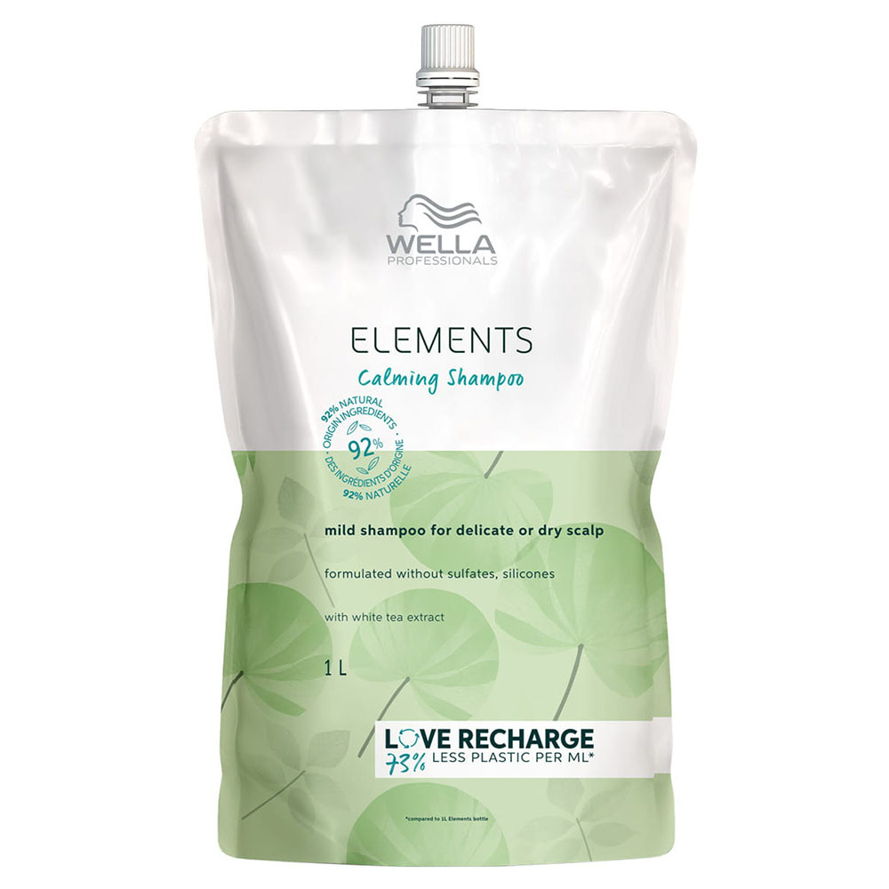 Wella Elements Calming to kojący szampon do wrażliwej i suchej skóry głowy, który przywraca komfort oraz dobre samopoczucie już od pierwszego użycia. Dzięki łagodnej formule opartej na surfaktantach pochodzenia naturalnego skutecznie oczyszcza, jednocześnie nawilżając i łagodząc skórę głowy. Produkt nie zawiera siarczanów, silikonów ani parabenów, bazuje aż w 92% na składnikach pochodzenia naturalnego i posiada wegańską formułę. Zapewnia zdrowy wygląd włosów, odświeżenie oraz piękny, naturalny blask. Szampon dostępny jest w ekologicznym opakowaniu typu refill o pojemności 1000 ml, co sprzyja dbałości o środowisko.
