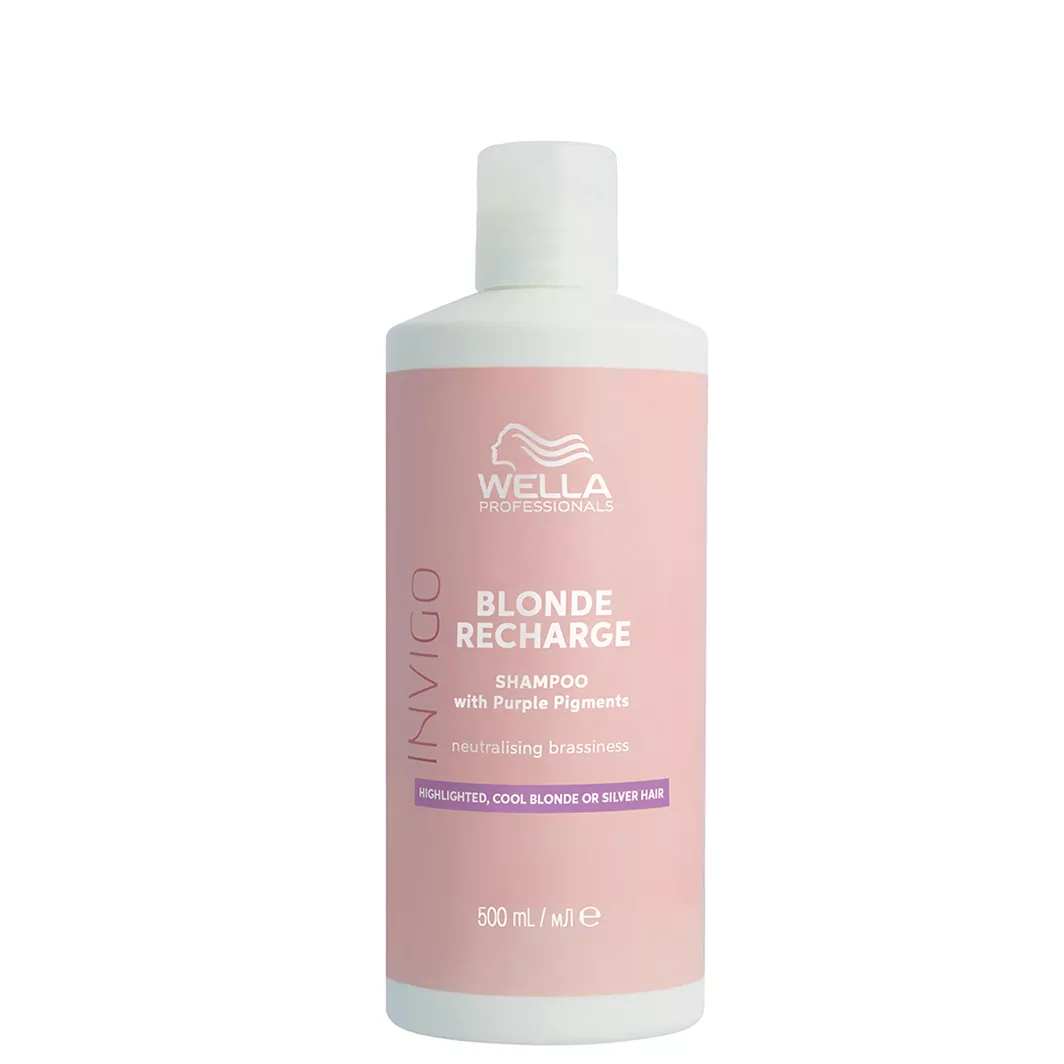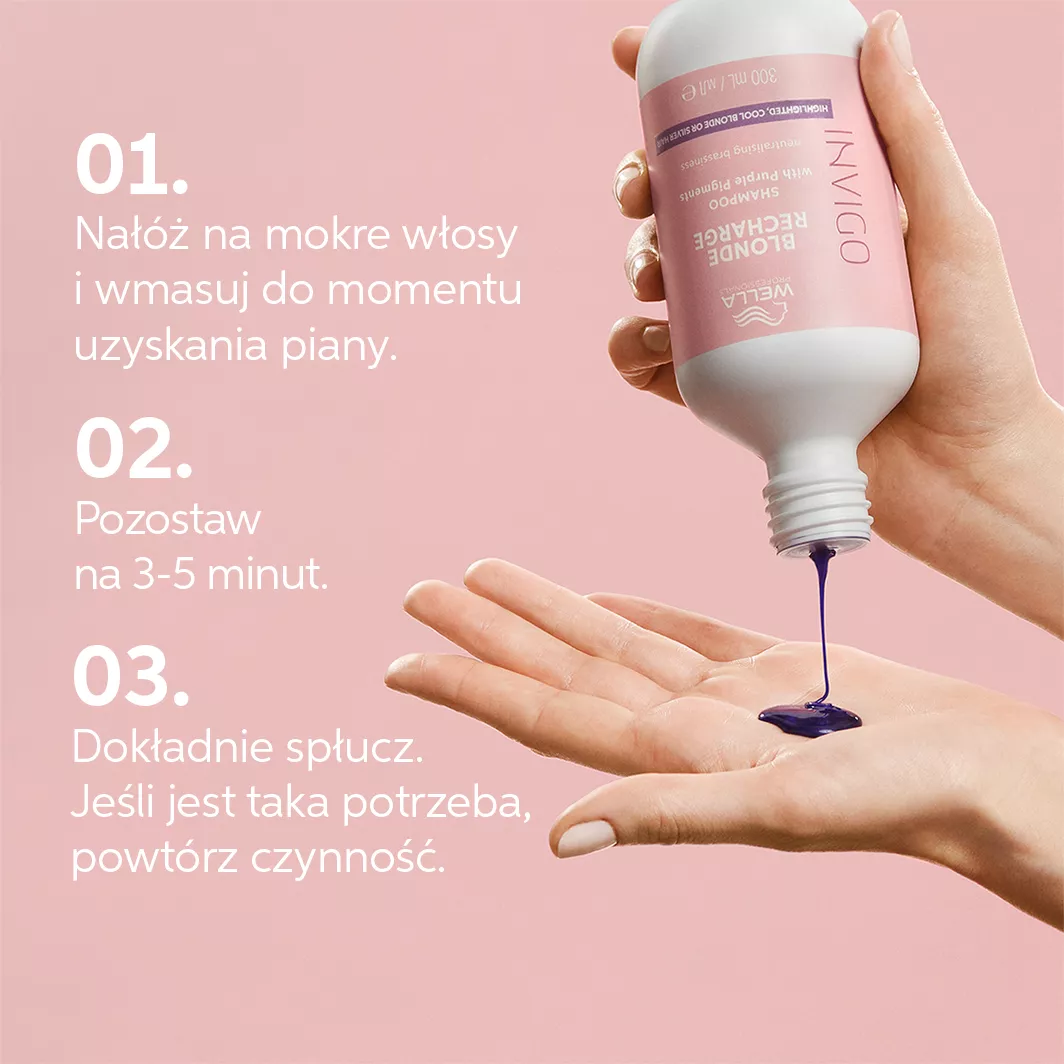 Wella INVIGO Blonde to profesjonalny szampon do włosów farbowanych blond oraz siwych, który skutecznie oczyszcza i jednocześnie pielęgnuje kolor. Dzięki zawartości fioletowych pigmentów, produkt neutralizuje niepożądane żółte odcienie, pozostawiając włosy w chłodnej, wyrafinowanej tonacji. Szampon polecany jest do regularnej pielęgnacji włosów blond i siwych, podkreślając ich świeżość oraz blask. W nowym, bardziej zrównoważonym opakowaniu pochodzącym w 80% z recyklingu, szampon o pojemności 500 ml doskonale sprawdzi się zarówno w domowej pielęgnacji, jak i w salonach fryzjerskich.
