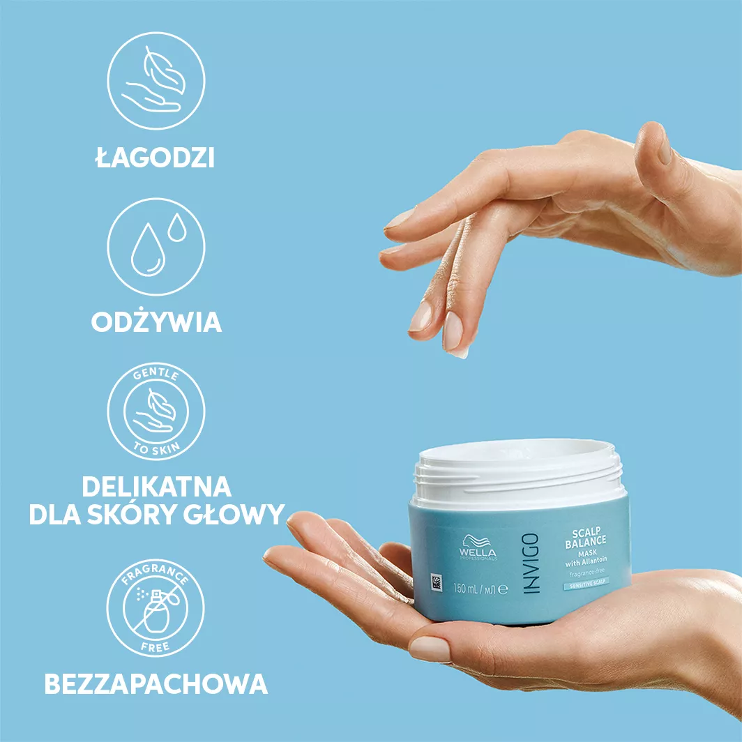 Wella INVIGO Scalp Balance to profesjonalna maska do wrażliwej skóry głowy o pojemności 150 ml, stworzona z myślą o osobach poszukujących łagodzącej i bezzapachowej pielęgnacji. Dzięki zawartości alantoiny maska skutecznie koi swędzącą skórę głowy, jednocześnie wzmacniając włosy i zapewniając uczucie świeżości. Delikatna formuła bez kompozycji zapachowej sprawia, że produkt jest odpowiedni nawet dla bardzo wrażliwej skóry. Linia INVIGO Balance to gwarancja czystości, odświeżenia i zdrowo wyglądających włosów.
