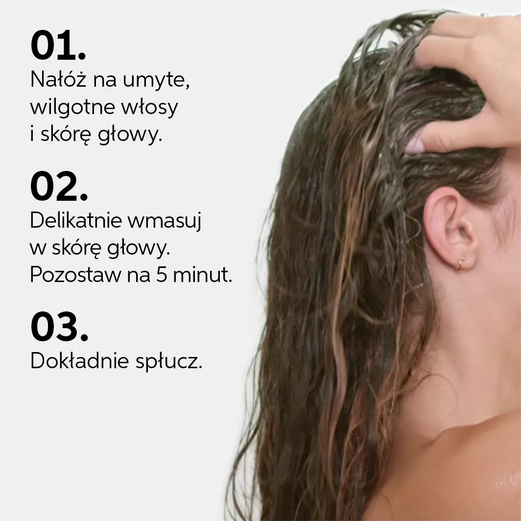 Na umyte i delikatnie osuszone włosy nałóż niewielką ilość maski. Rozprowadź równomiernie wzdłuż całej długości włosów oraz na skórze głowy. Pozostaw na kilka minut, a następnie dokładnie spłucz wodą.