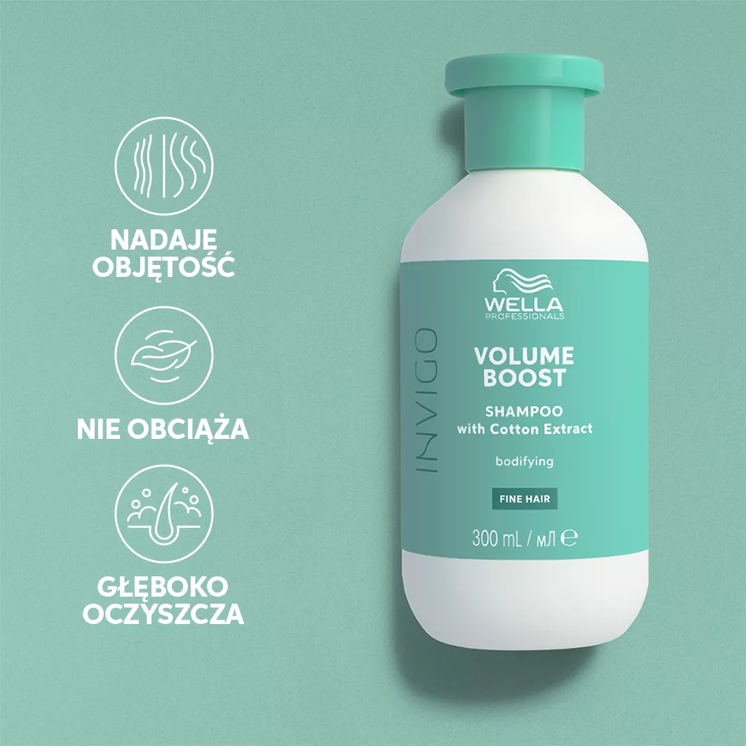 Wella INVIGO Volume Boost to profesjonalny szampon do włosów cienkich, który oczyszcza i wyraźnie zwiększa objętość fryzury już od pierwszego użycia. Dzięki ekstraktowi z bawełny oraz innowacyjnemu kompleksowi Volume-Boost-Blend, szampon skutecznie pielęgnuje włosy, nie obciążając ich, a jednocześnie sprawia, że stają się grubsze, bardziej sprężyste i pełne blasku. Lekka formuła sprawia, że nawet najcieńsze pasma zyskują spektakularną objętość, łatwo się układają i zyskują zdrowy wygląd. Produkt posiada świeży, kwiatowo-drzewny zapach z piżmową nutą oraz ekologiczne opakowanie pochodzące w 80% z recyklingu.