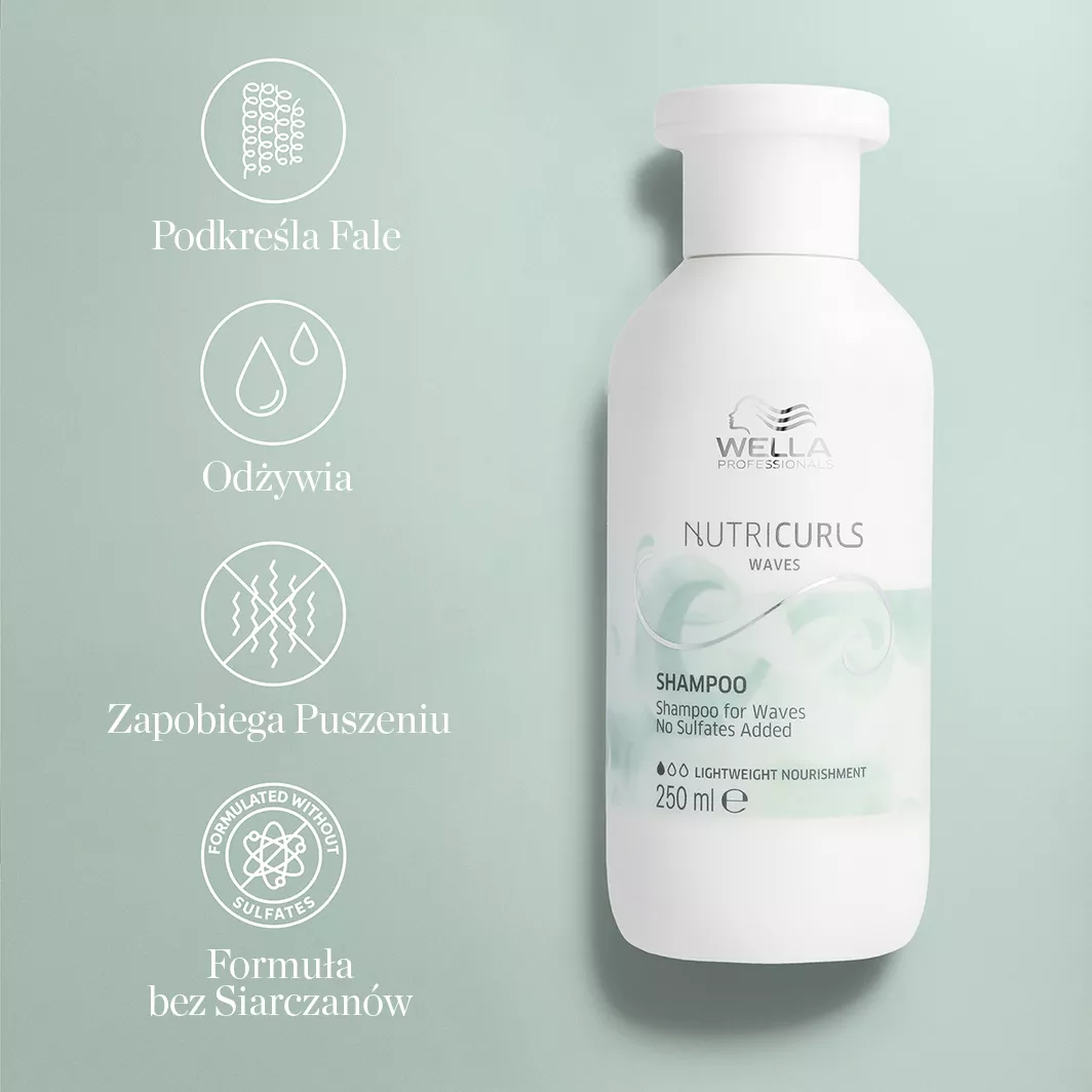Odkryj wyjątkową pielęgnację włosów falowanych z szamponem Wella Nutricurls. Ten lekki szampon odżywczy został stworzony specjalnie po to, aby podkreślać naturalną elastyczność fal, delikatnie oczyszczać i skutecznie usuwać zanieczyszczenia – wszystko bez dodatku siarczanów. Dzięki kompleksowi NOURISHI-IN, zawierającemu ekstrakt z otrębów pszennych oraz odżywczy olejek jojoba, pomaga utrzymać odpowiedni poziom nawilżenia, pozostawiając włosy miękkie, sprężyste i pełne blasku. Wella Nutricurls to także troska o środowisko – opakowanie produktu pochodzi nawet w 80% z recyklingu.