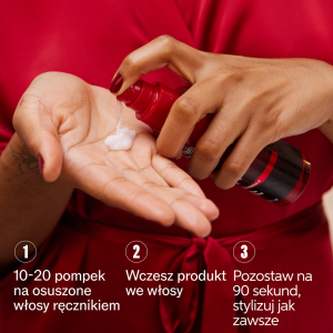 W zależności od długości włosów, rozprowadź 5–15 pompek serum na umyte, wilgotne włosy. Dokładnie rozczesz, aby równomiernie rozprowadzić produkt. Nie spłukuj. Po upływie 90 sekund możesz nałożyć kolejne kosmetyki lub przystąpić do stylizacji.