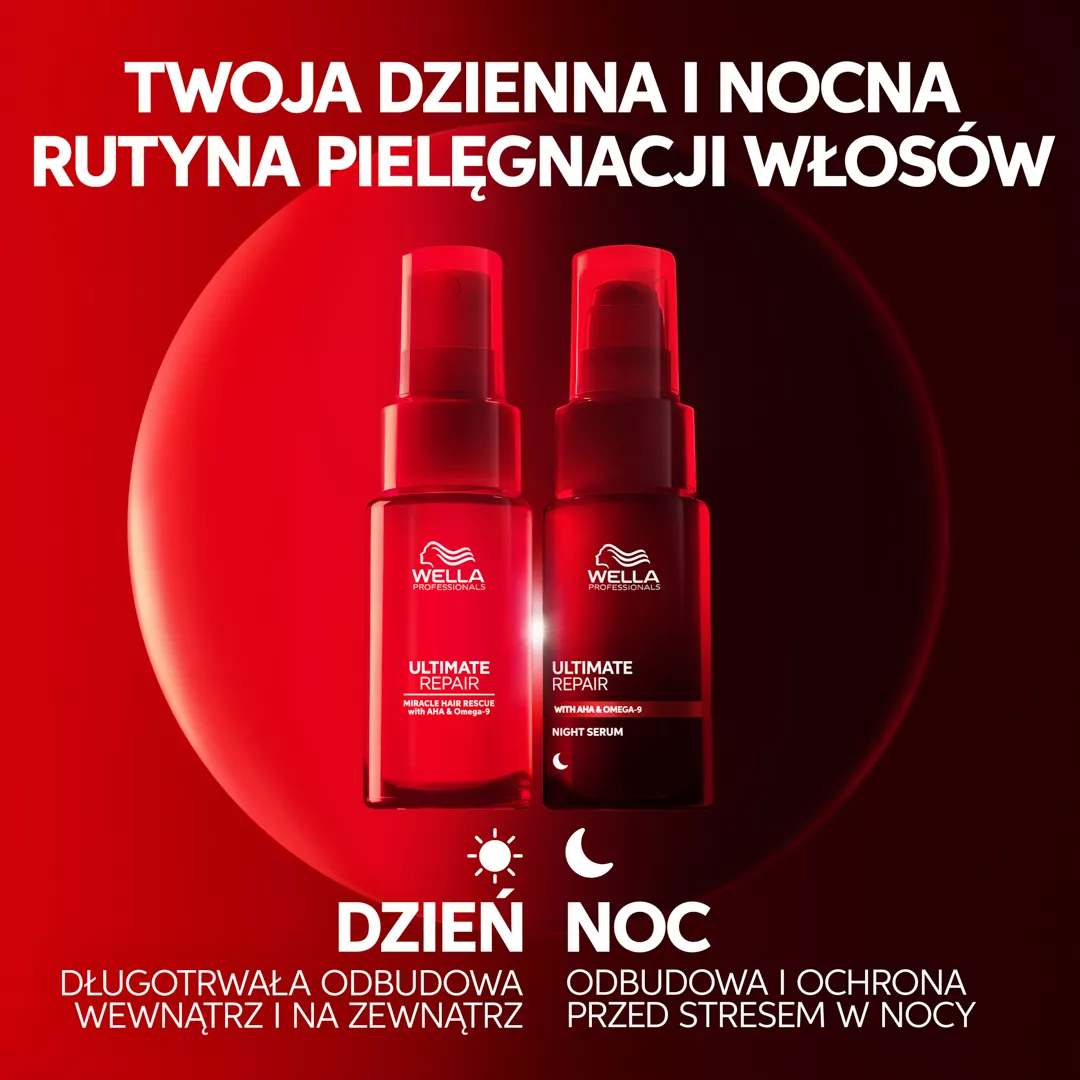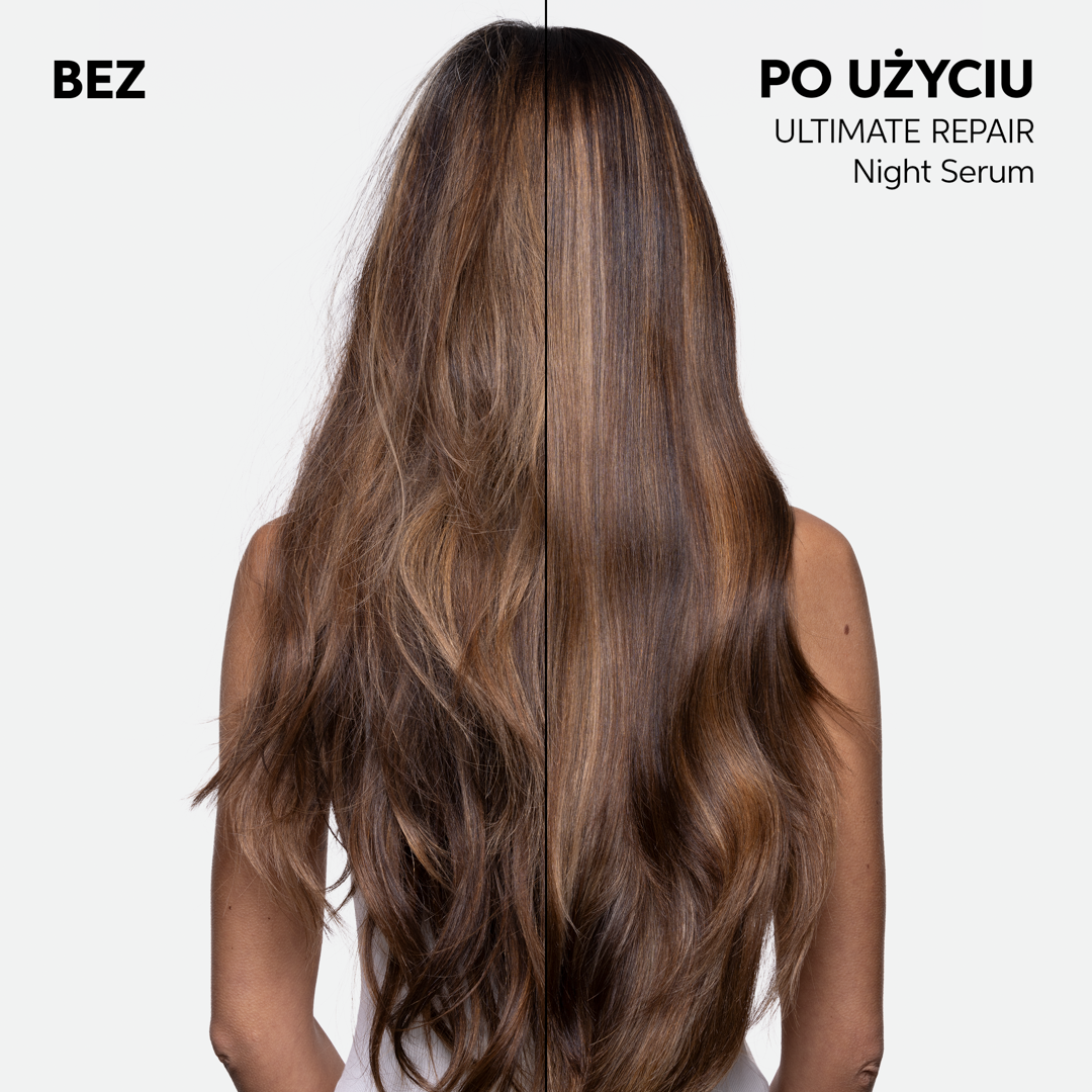 Poznaj nocne serum bez spłukiwania Wella Ultimate Repair – innowacyjny produkt do każdego rodzaju włosów, który wykorzystuje czas Twojego snu, by intensywnie regenerować, nawilżać i chronić włosy. Dzięki potrójnej mocy lekkiej formuły, serum naprawia nawet mocno zniszczone pasma, dogłębnie je odżywia i zabezpiecza przed czynnikami zewnętrznymi. Specjalnie opracowana formuła z kwasem Omega-9 oraz polimerami ochronnymi działa przez 8 godzin, dbając o kondycję włosów podczas snu. Już po pierwszej nocy włosy zyskują niesamowitą gładkość, wyglądają na wypoczęte, mniej zmęczone i są znacznie łatwiejsze do rozczesania. Po tygodniu regularnego stosowania zauważysz do 78% mniej łamliwości oraz do 86% mniej rozdwojonych końcówek. Serum jest bezpieczne dla poduszki i nie wymaga spłukiwania.