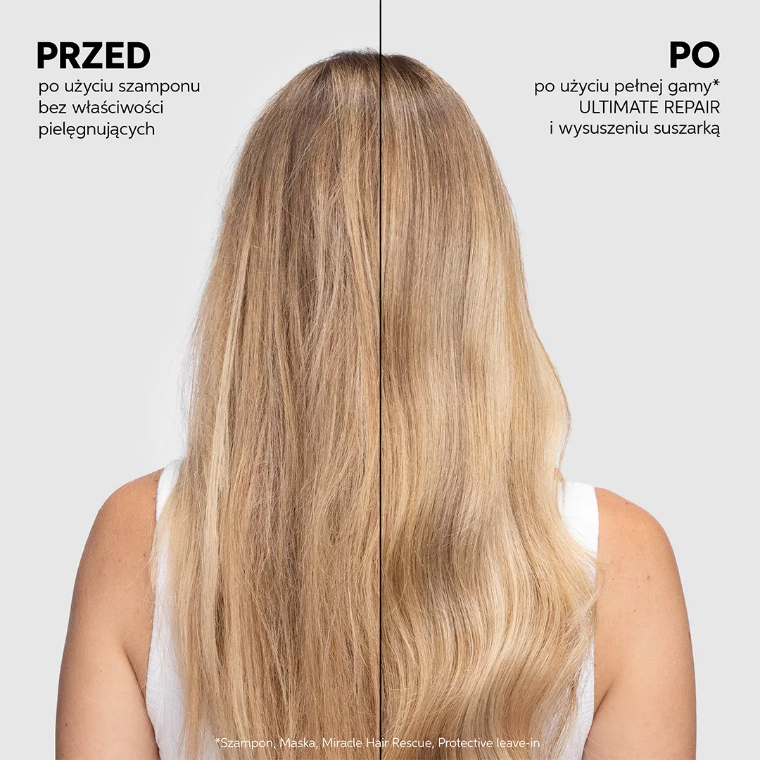 Wella Ultimate Repair to profesjonalna kremowa maska do włosów zniszczonych, która zapewnia intensywną regenerację i przywraca naturalny blask już po pierwszym użyciu. Luksusowa formuła opracowana przez ekspertów Wella Professionals odbudowuje strukturę włosów zarówno od wewnątrz, jak i na zewnątrz. Maska skutecznie wygładza nawet najbardziej zniszczone pasma, ułatwia ich rozczesywanie oraz chroni przed dalszymi uszkodzeniami wywołanymi przez wysoką temperaturę i promienie UV. Jej regularne stosowanie pozwala cieszyć się zdrowymi, elastycznymi i lśniącymi włosami na długo.