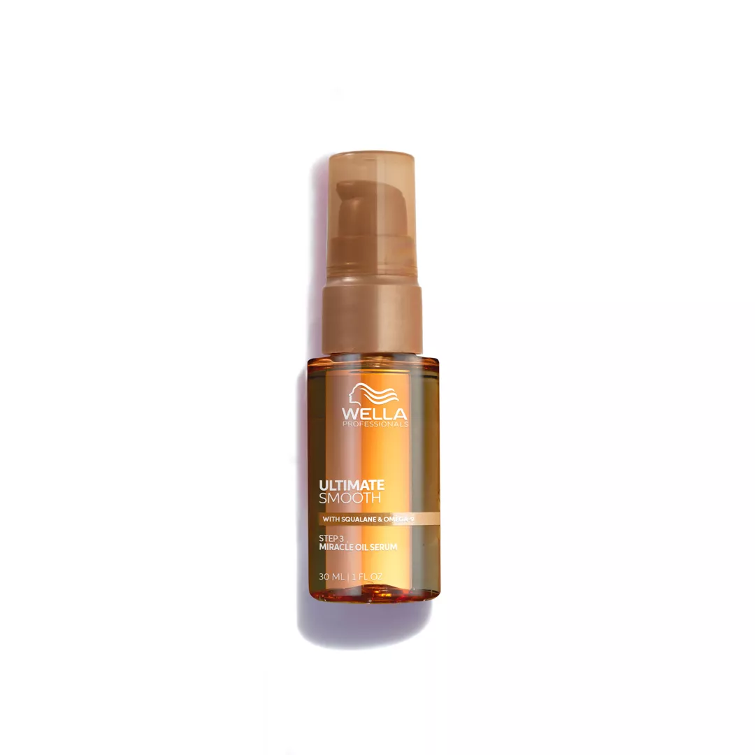 Wella Ultimate Smooth Miracle Oil to wygładzające serum do włosów stworzone z myślą o intensywnej pielęgnacji suchych, matowych i puszących się włosów. Zawiera cenne składniki, takie jak squalane i Omega-9, które dogłębnie odżywiają włosy od wewnątrz i na zewnątrz, pozostawiając je jedwabiście gładkie i pełne blasku. Produkt działa już w 30 sekund i zapewnia do 96 godzin kontroli puszenia oraz ochronę przed promieniowaniem UV i wysoką temperaturą do 230°C. Unikalna kompozycja zapachowa z nutami jaśminu, wanilii, bergamotki, brzoskwini i drzewa sandałowego sprawia, że każde użycie to wyjątkowe doznanie. Dla najlepszych efektów stosuj w połączeniu z innymi produktami z linii Ultimate Smooth, aby uzyskać nawet dwukrotnie lepszą kontrolę puszenia*.