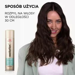 Spryskaj włosy trzymając lakier w odległości 20-30 cm. Aby uzyskać większą objętość, spryskaj u nasady włosów, pochylając głowę w dół.