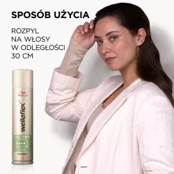 Spryskaj lakier z odległości 20-30 cm od włosów. Aby uzyskać większą objętość, aplikuj u nasady, trzymając głowę odwróconą w dół.