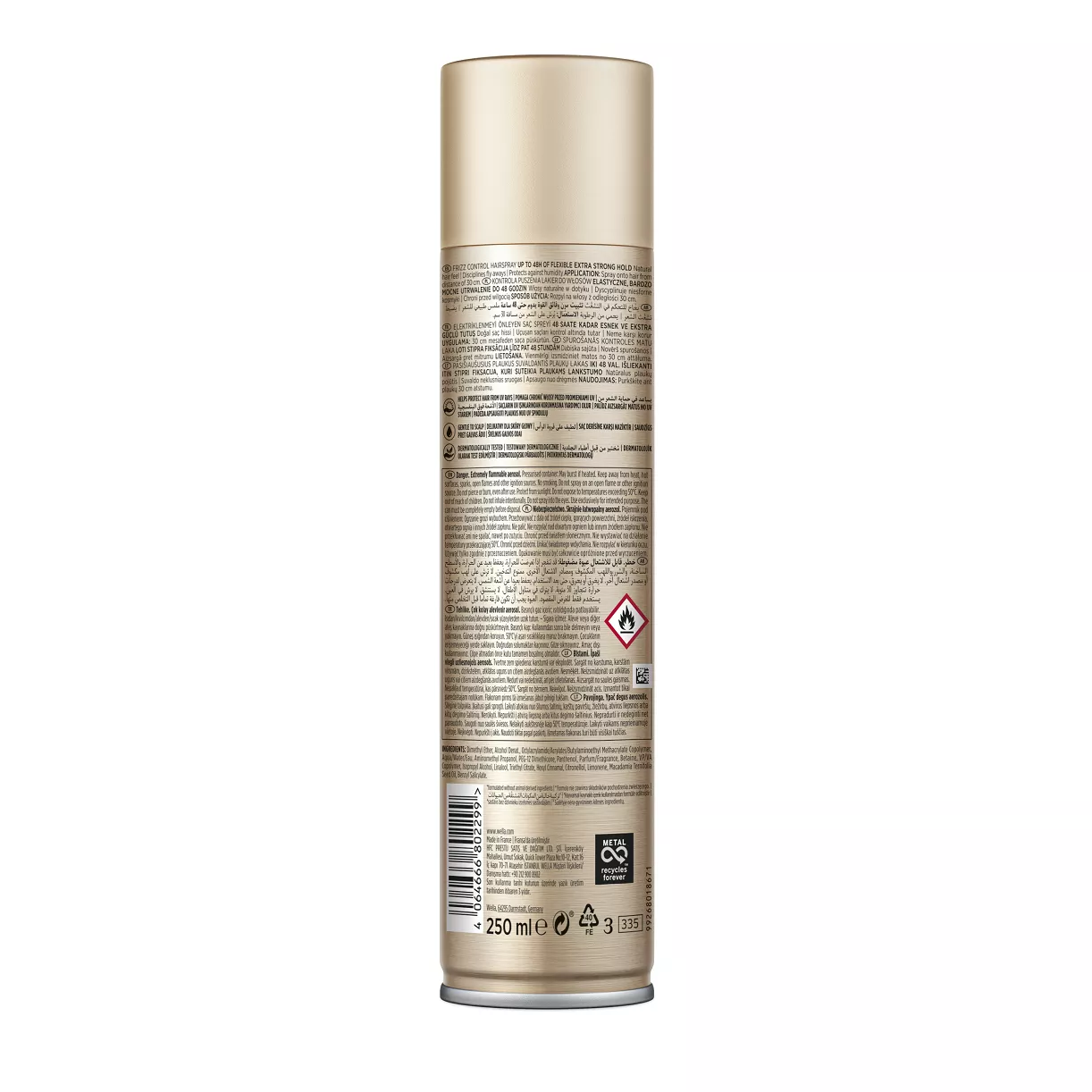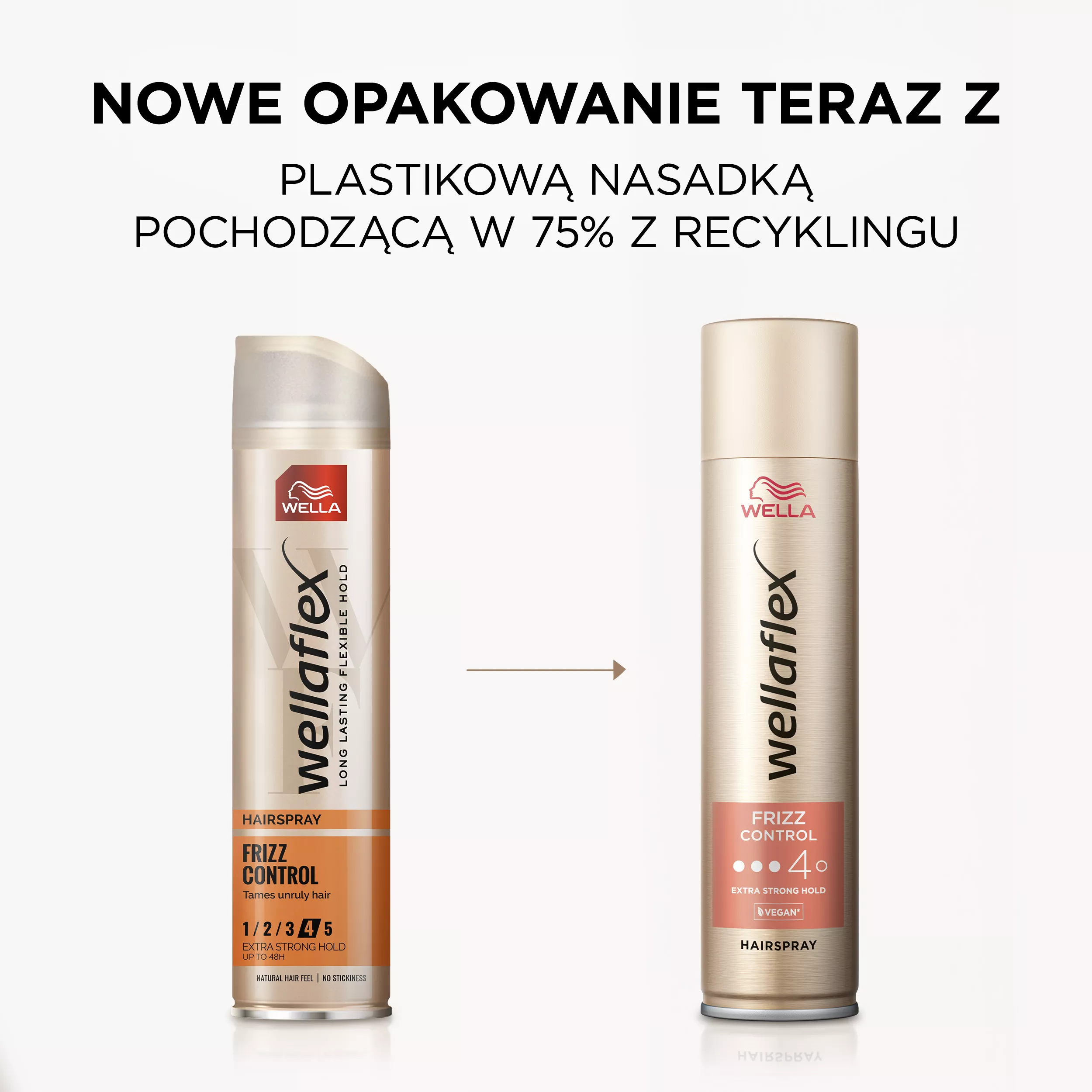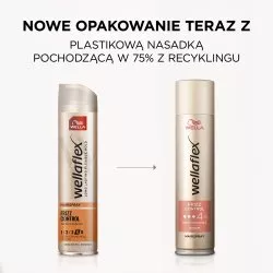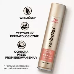 Ujarzmij swoje puszące się włosy i zapewnij im aż do 48 godzin wyjątkowo mocnego utrwalenia dzięki lakierowi do włosów Wellaflex Frizz Control. Ten delikatny dla skóry głowy, przetestowany dermatologicznie spray do stylizacji włosów dla kobiet pozostawia włosy naturalne i oferuje elastyczne utrwalenie, na którym możesz polegać. Wegański* lakier do włosów ujarzmia kosmyki i chroni przed wilgocią, a także zapewnia ochronę przed promieniowaniem UV podczas ekspozycji na słońce. Co więcej, opakowanie Wellaflex Frizz Control Hairspray zawiera korek wykonany w 75% z tworzywa sztucznego pochodzącego z recyklingu.