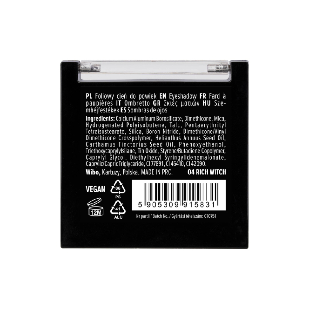 Odkryj Wibo High Flex foliowy cień do powiek 04 Rich Witch 2.5g – wyjątkowy kosmetyk, który pozwala uzyskać efekt lustra i mokrej folii na powiekach. Jego ultrafoliowe wykończenie już po jednej warstwie tworzy gładką taflę odbijającą światło, nadając makijażowi niezwykłą głębię i wielowymiarowy połysk. Formuła inspirowana płynnym, metalicznym szkłem sprawia, że cień sunie po skórze z kremową lekkością, nie osypuje się i nie tworzy smug. Wysoka koncentracja pigmentu gwarantuje maksymalne nasycenie koloru, który pozostaje intensywny przez wiele godzin. Produkt nie wymaga bazy ani utrwalacza, co czyni go doskonałym wyborem na każdą okazję.