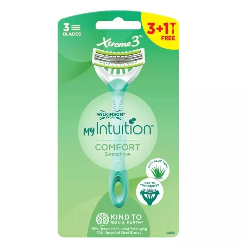 Maszynki do golenia Wilkinson My Intuition Xtreme3 Comfort Sensitive zostały zaprojektowane specjalnie dla kobiet, oferując jedyne w swoim rodzaju elastyczne ostrza, które doskonale dopasowują się do kształtów ciała. Dzięki nim golenie staje się dokładne i komfortowe pod każdym kątem. Produkt zapewnia poczucie nawilżenia i komfortu dzięki paska nawilżającemu, a także ułatwia precyzyjne golenie za pomocą paska napinającego skórę. Lekka, profilowana i gumowana rączka gwarantuje stabilność i pewność podczas golenia.