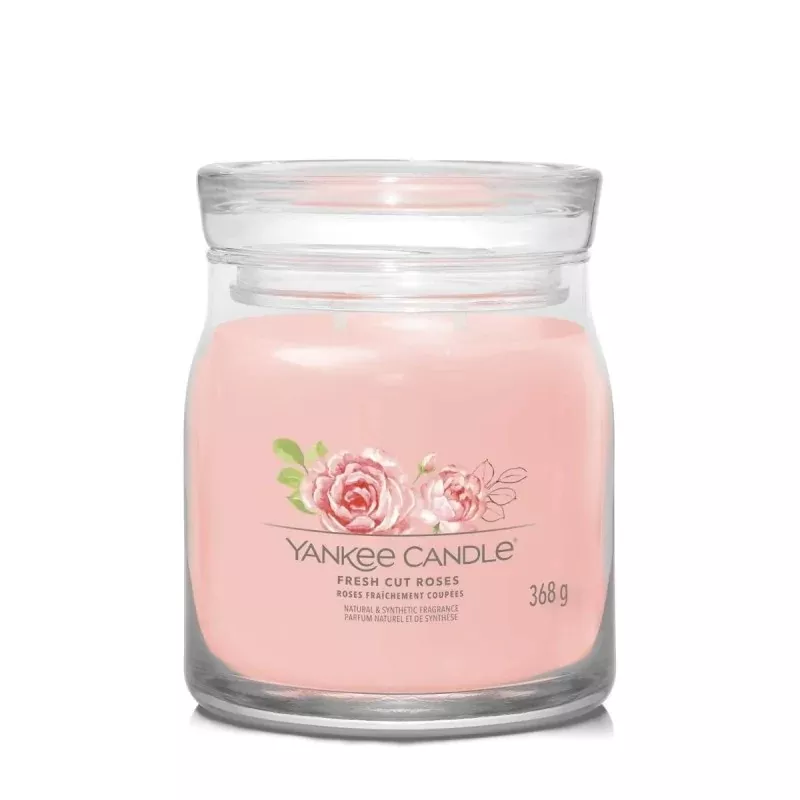 Odkryj wyjątkowy zapach świeżo ściętych róż z Yankee Candle Średnia świeca zapachowa Fresh Cut Roses 368g. Ta świeca z kolekcji Signature charakteryzuje się odświeżonym designem słoika, najwyższej jakości mieszanką wosku sojowego oraz dwoma bawełnianymi knotami, które zapewniają równomierne spalanie. Ilustrowane ręcznie etykiety i żywe kolory wosku doskonale oddają zapach świecy, tworząc niepowtarzalną atmosferę w Twoim domu.