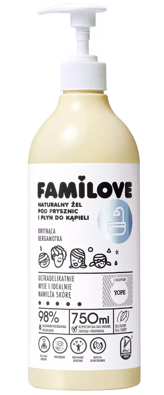 Yope Familove, płyn do kąpieli & żel pod prysznic, kwitnąca bergamotka to idealny produkt dla całej rodziny, który delikatnie oczyszcza skórę, nie powodując jej przesuszenia. Dzięki zawartości allantoiny, produkt łagodzi podrażnienia i wspiera regenerację skóry, a masło murumuru zapewnia nawilżenie, wygładzenie i poprawę elastyczności. Po kąpieli skóra jest pachnąca i gładka, a neutralne pH sprawia, że produkt jest bezpieczny dla każdego rodzaju skóry. Co więcej, aż 97% składników jest pochodzenia naturalnego, co czyni go idealnym wyborem dla osób dbających o naturalną pielęgnację.