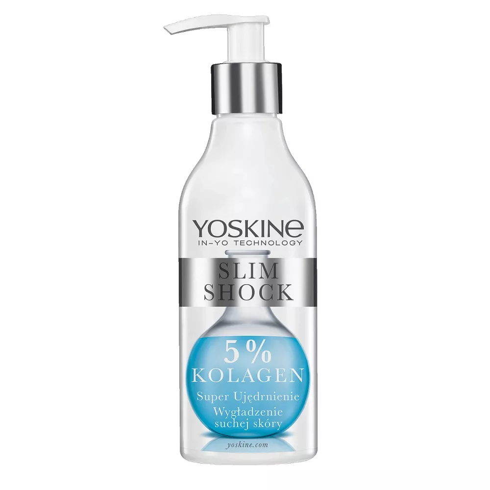 Yoskine Slim Shock to profesjonalny balsam ujędrniający z 5% zawartością kolagenu, który został stworzony w celu intensywnego ujędrnienia i odmłodzenia skóry. Dzięki wysokiej zawartości kolagenu morskiego, produkt skutecznie poprawia jędrność, gładkość i sprężystość skóry, szybko niwelując utratę napięcia i wiotkość. Balsam wypełnia skórę od środka, doskonale ją uelastycznia, liftinguje i odmładza, co czyni go idealnym wyborem także dla suchej skóry.