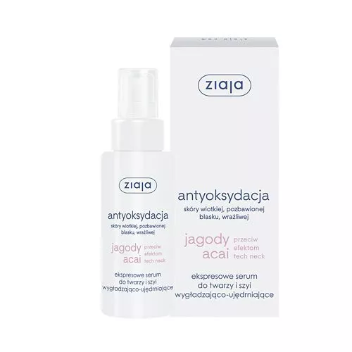 Czy znasz supermoc jagód acai? Te niezwykłe owoce neutralizują wolne rodniki i są doskonałymi antyoksydantami. Dzięki temu hamują powstawanie zmarszczek, działają ujędrniająco, wzmacniają skórę, łagodzą podrażnienia i zapewniają promienny oraz zdrowy wygląd. Jagody acai są głównym składnikiem aktywnym ekspresowego serum do twarzy i szyi Ziaja Antyoksydacja. Kosmetyk wygładza skórę i poprawia jej jędrność, a jego formuła kremu-żelu szybko się wchłania, przywracając skórze zdrowy i promienny wygląd. Serum ujednolica koloryt cery, łagodzi zaczerwienienia i przeciwdziała efektom tech neck, wynikającym z częstego pochylania się nad urządzeniami elektronicznymi.