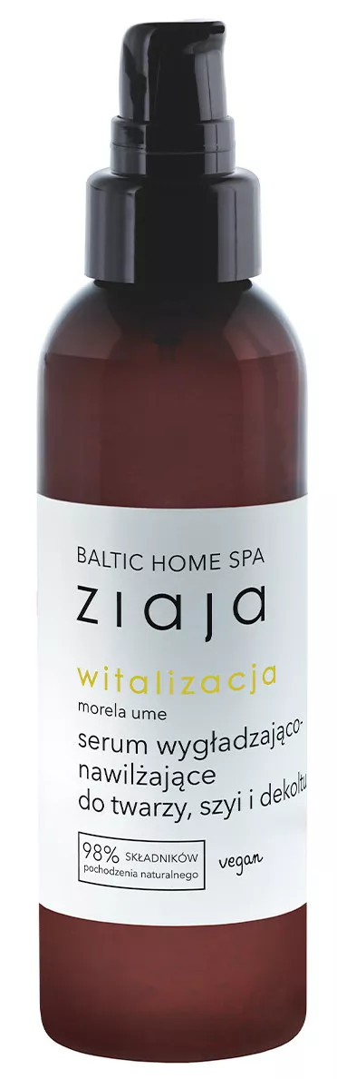 Serum do twarzy Ziaja Baltic Home Spa to innowacyjny kosmetyk, który błyskawicznie poprawia kondycję i wygląd skóry. Ten wegański produkt wygładza naskórek, nawilża i zwiększa jędrność, nadając cerze promienny wygląd. Serum przynosi przyjemne uczucie odświeżenia, szybko się wchłania i nie pozostawia lepkiej warstwy. Posiada relaksujący zapach, który umila codzienną pielęgnację. W jego składzie znajdują się kluczowe składniki, takie jak kwas hialuronowy, ekologiczne emolienty, ekstrakt z moreli ume oraz wegański kolagen.