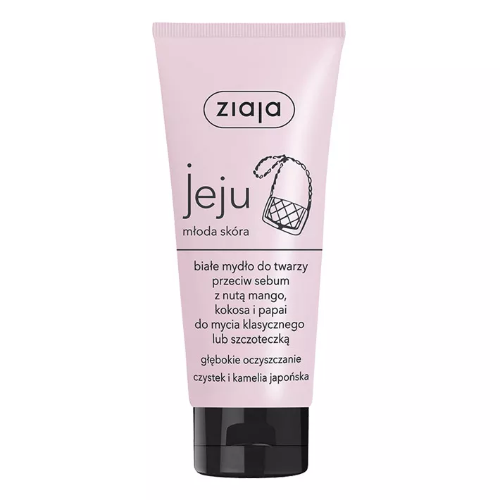 Specjalnie z myślą o młodej cerze, która boryka się z nadmiarem sebum, opracowano formułę białego mydła do twarzy Ziaja Jeju. Kosmetyk ten delikatnie myje skórę bez naruszania jej naturalnej bariery ochronnej, odblokowuje pory i usuwa nadmiar sebum. Dodatkowo, jego zapach to przyjemna mieszanka mango, kokosa i papai. Dzięki zawartości oleju z kamelii japońskiej, mydło doskonale nawilża skórę, a wyciąg z czystka pomaga pozbyć się trądziku. Mydło można nakładać dłonią albo stosować przy użyciu szczoteczki do twarzy.