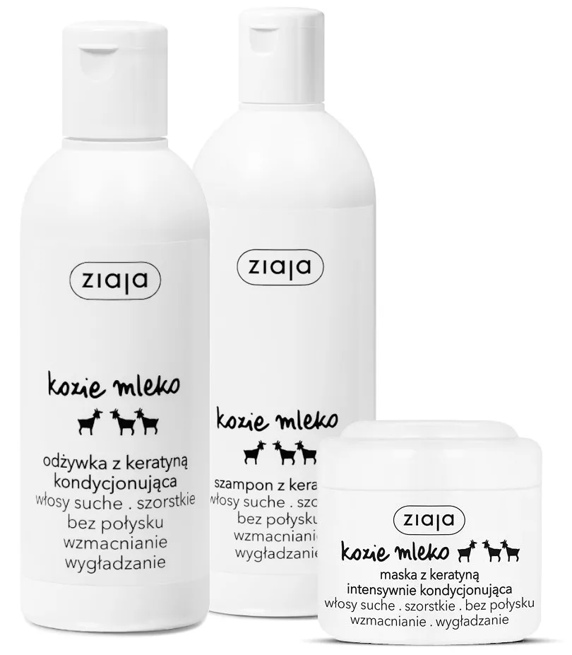 Odkryj perfekcyjne rozwiązanie dla włosów suchych, matowych i zniszczonych. Zestaw kosmetyków do włosów Ziaja Kozie Mleko z keratyną wzmacnia i wygładza włosy, uzupełniając ubytki w ich strukturze. Działa od wewnątrz, niczym solidna budowla, zapewniając odbudowę włosów. Szampon dodaje objętości, a kompleks składników aktywnych zapobiega kruchości i łamliwości, pozostawiając włosy gładkie i miękkie w dotyku.